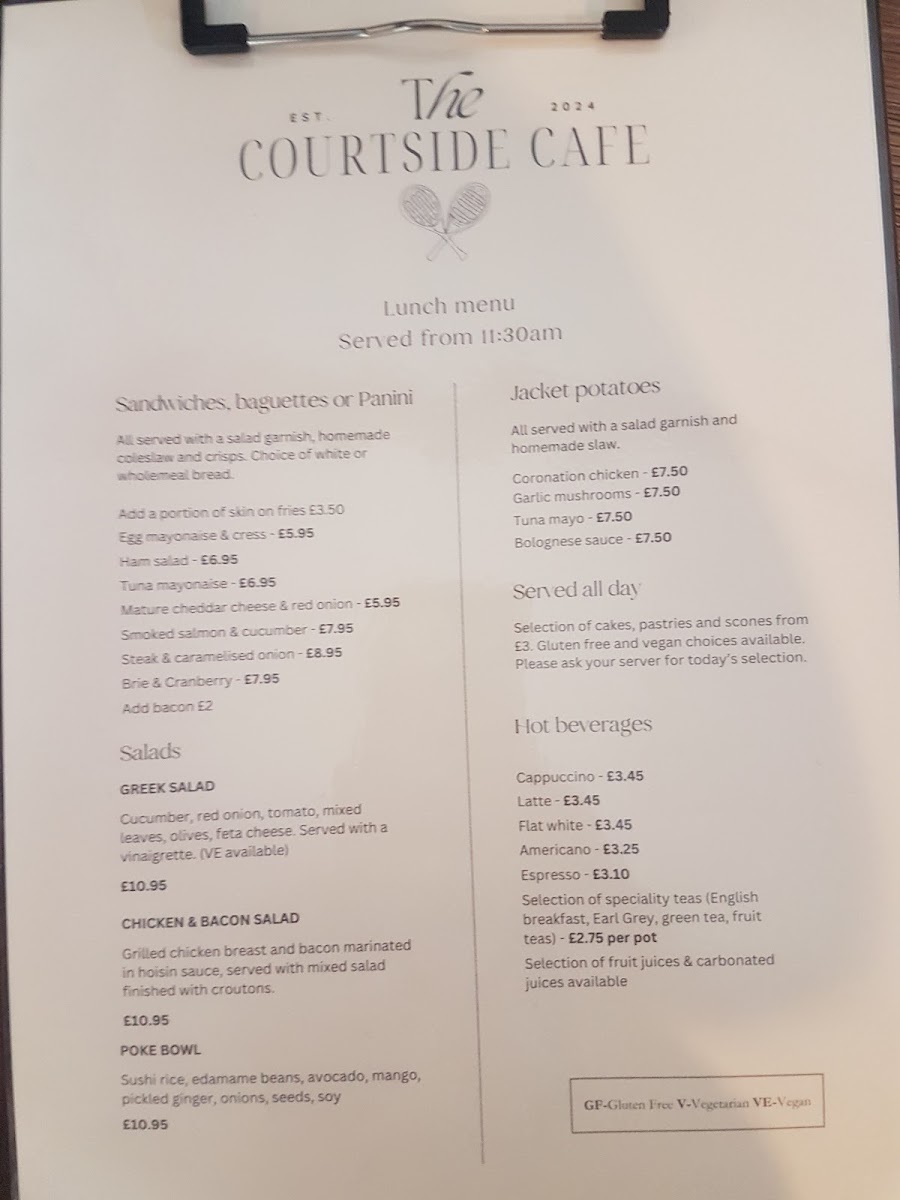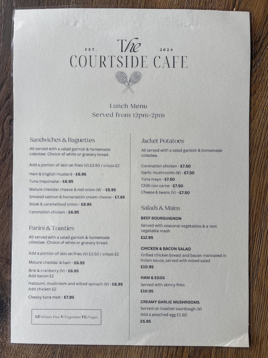 For lunch, indulge in a selection of mouthwatering dishes such as the Coronation Chicken Jacket Potato or the delightful Chicken & Bacon Salad, which combines tender pieces of chicken with crispy bacon and fresh greens in a delicious dressing. The hearty Beef Bourguignon offers rich flavors, comforting your palate like a warm hug after a chilly day of tennis. Vegetarian options, like the Creamy Garlic Mushrooms, make a perfect side or light meal that leaves you wanting more. And don’t forget to compliment your meal with one of their delicious homemade cakes—just be sure to arrive early to snag a slice of the popular carrot cake!